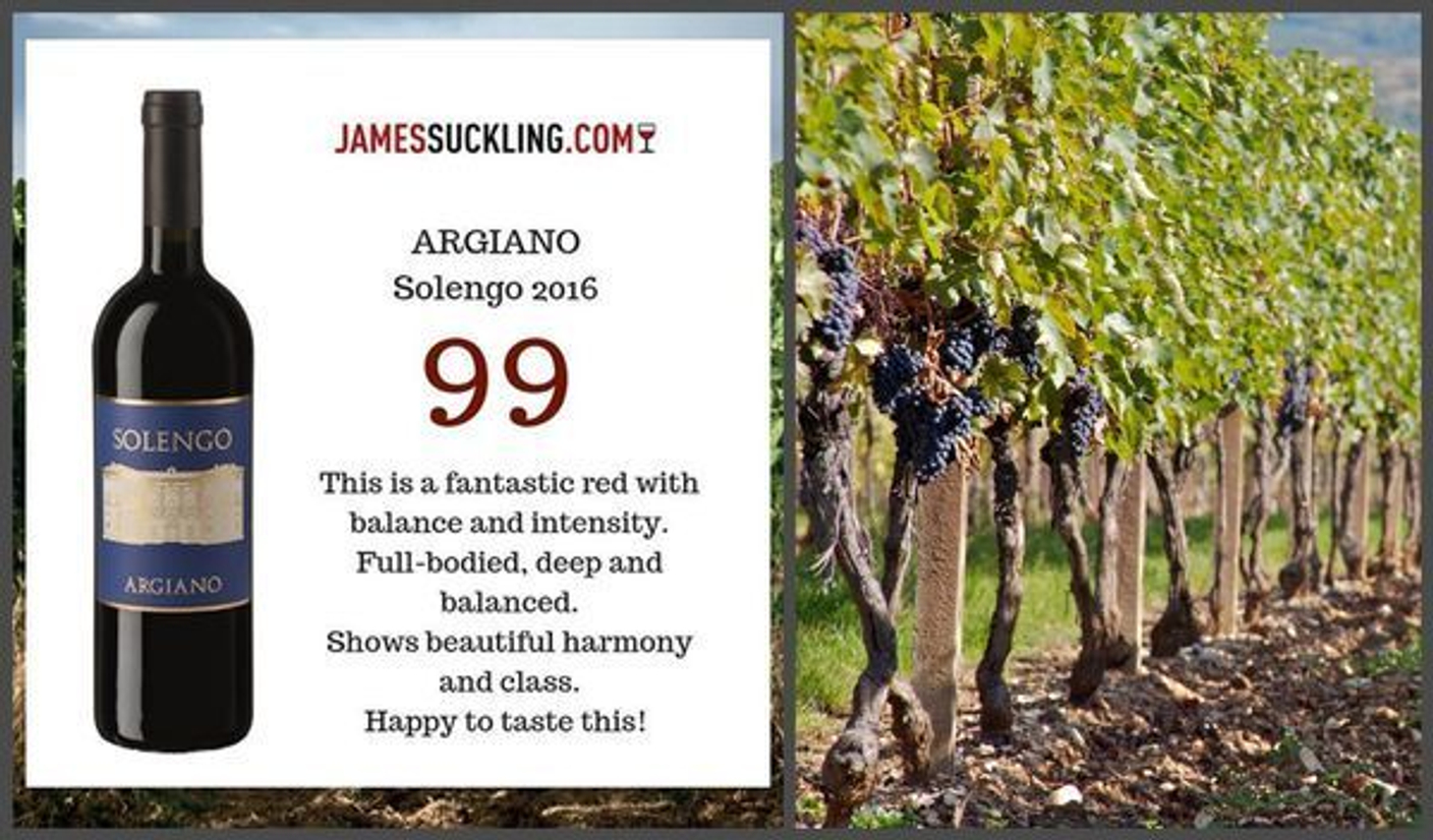 Авторитетный винный критик Джеймс Саклинг присудил 99 баллов "суперетосканскому" вину Solengo 2016, созданному в хозяйстве Argiano, высоко оценив его комплексный, собранный, очень энергичный и при этом элегантный характер.