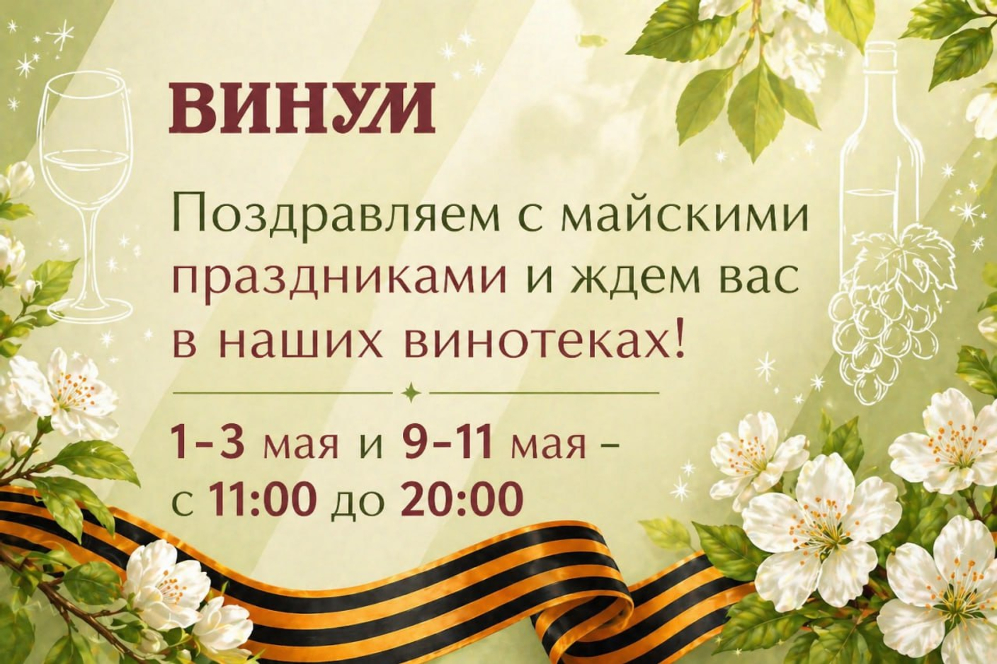 С майскими праздниками! Ждём вас в винотеках Винум: 1–3 мая и 9–11 мая мы работаем с 11:00 до 20:00.
